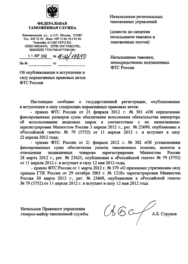 "ОБ ОПУБЛИКОВАНИИ И ВСТУПЛЕНИИ В СИЛУ НОРМАТИВНЫХ ПРАВОВЫХ АКТОВ ФТС РОССИИ"