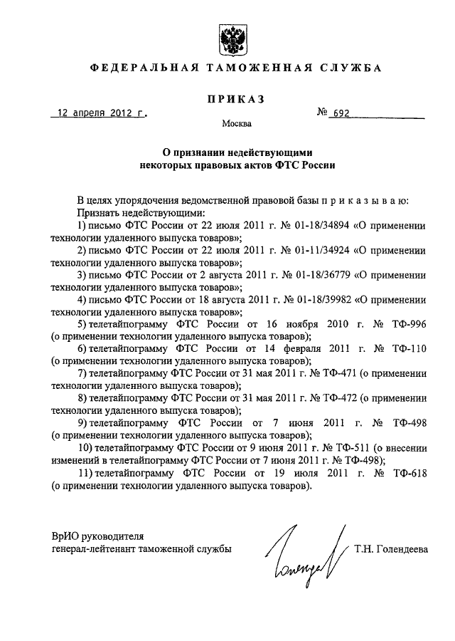 ПРИКАЗ ФТС РФ от 12.04.2012 N 692
