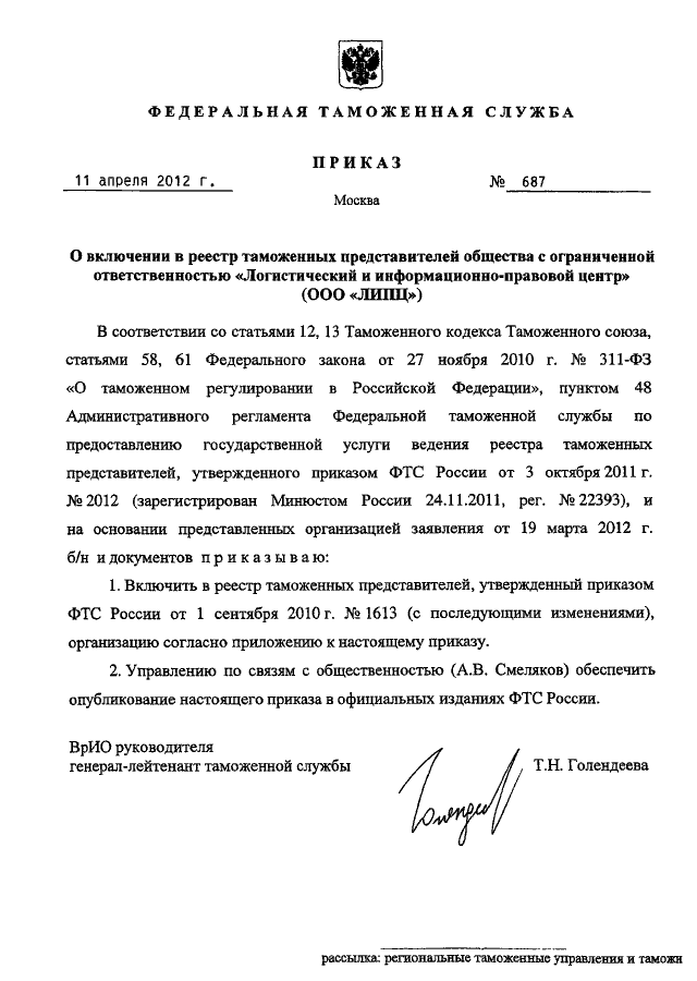 ПРИКАЗ ФТС РФ от 11.04.2012 N 687