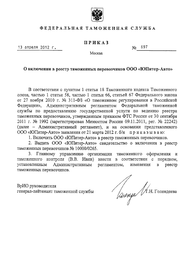 "О ВКЛЮЧЕНИИ В РЕЕСТР ТАМОЖЕННЫХ ПЕРЕВОЗЧИКОВ ООО "ЮПИТЕР-АВТО"