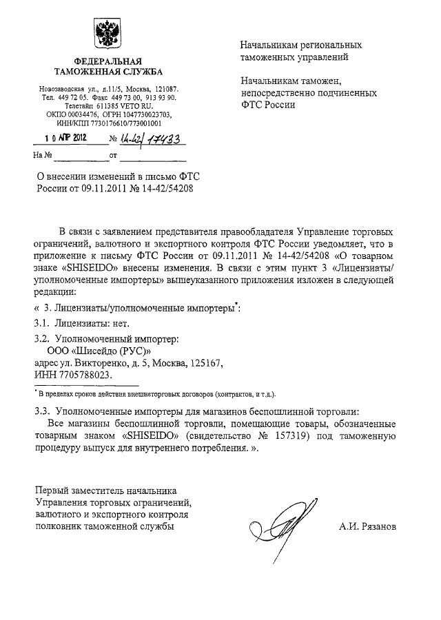 "О ВНЕСЕНИИ ИЗМЕНЕНИЙ В ПИСЬМО ФТС РОССИИ ОТ 09.11.2011 N 14-42/54208"