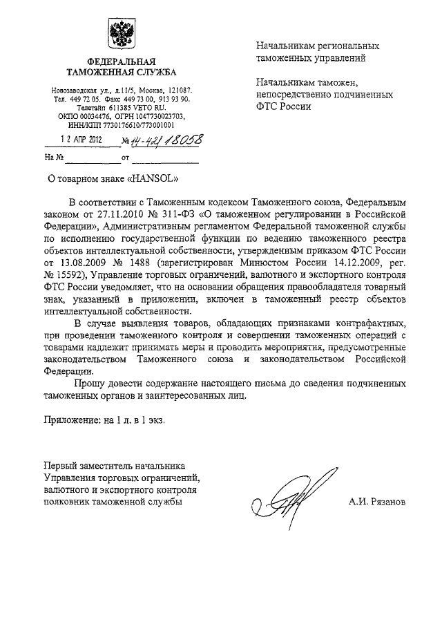 ПИСЬМО ФТС РФ от 12.04.2012 N 14-42/18058