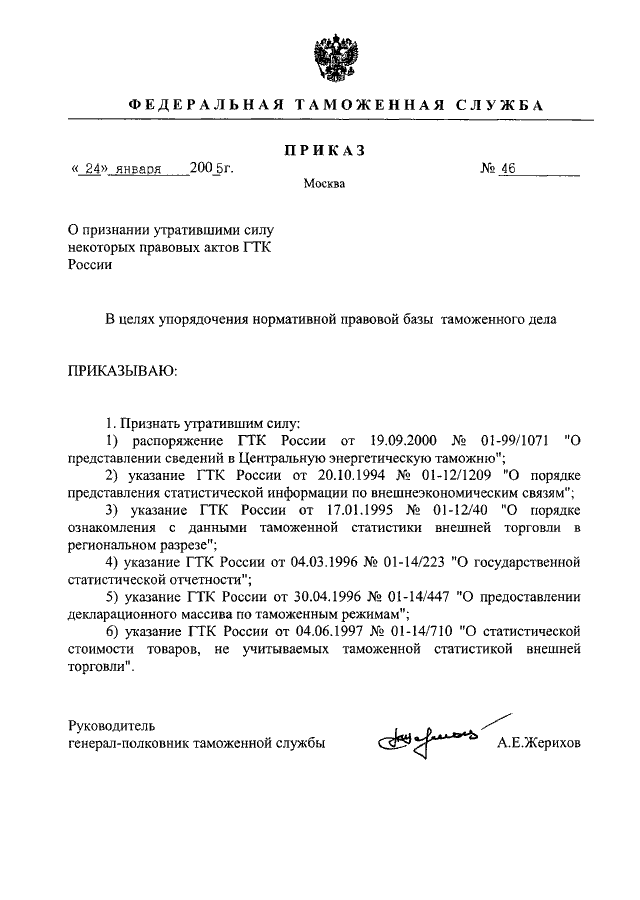 ПРИКАЗ ФТС РФ от 24.01.2005 N 46