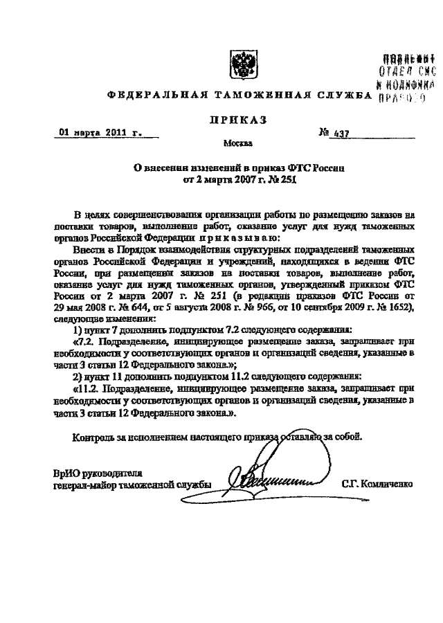 ПРИКАЗ ФТС РФ от 01.03.2011 N 437