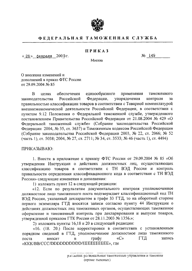 ПРИКАЗ ФТС РФ от 28.02.2005 N 149