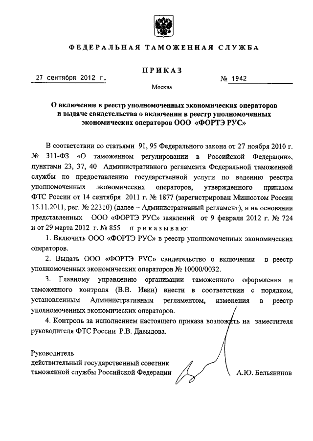 "О ВКЛЮЧЕНИИ В РЕЕСТР УПОЛНОМОЧЕННЫХ ЭКОНОМИЧЕСКИХ ОПЕРАТОРОВ И ВЫДАЧЕ СВИДЕТЕЛЬСТВА О ВКЛЮЧЕНИИ В РЕЕСТР УПОЛНОМОЧЕННЫХ ЭКОНОМИЧЕСКИХ ОПЕРАТОРОВ ООО "ФОРТЭ РУС"