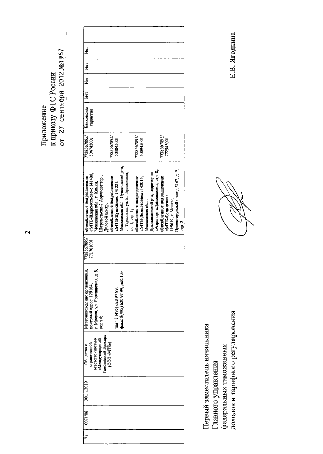 ПРИКАЗ ФТС РФ от 27.09.2012 N 1957