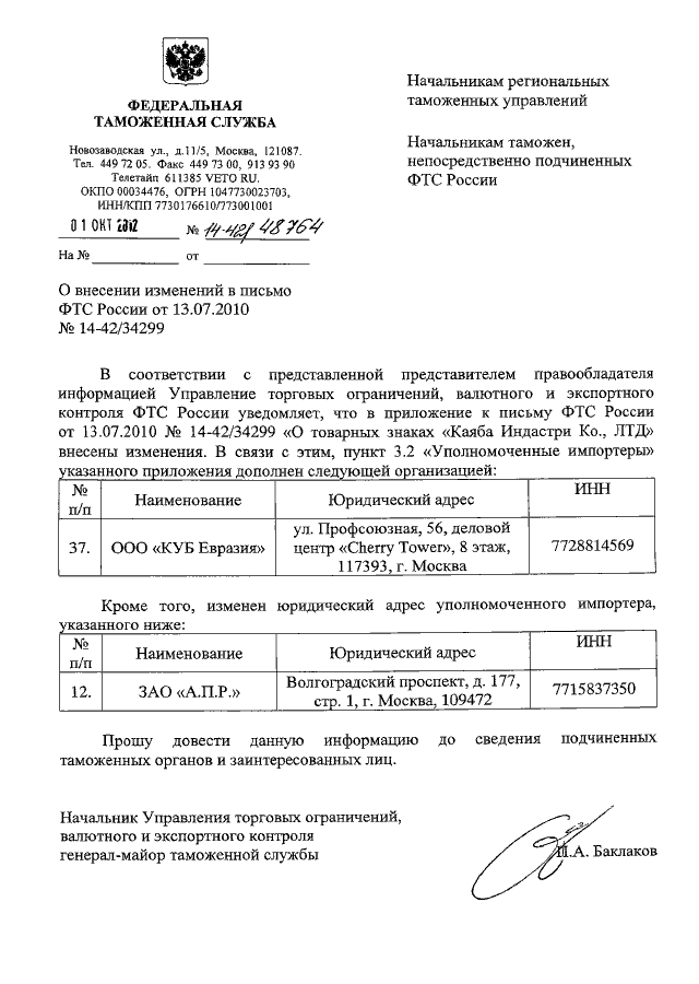 "О ВНЕСЕНИИ ИЗМЕНЕНИЙ В ПИСЬМО ФТС РОССИИ ОТ 13.07.2010 N 14-42/34299"