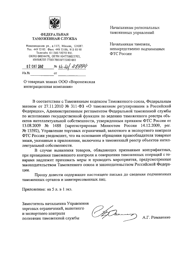 ПИСЬМО ФТС РФ от 02.10.2012 N 14-42/48994