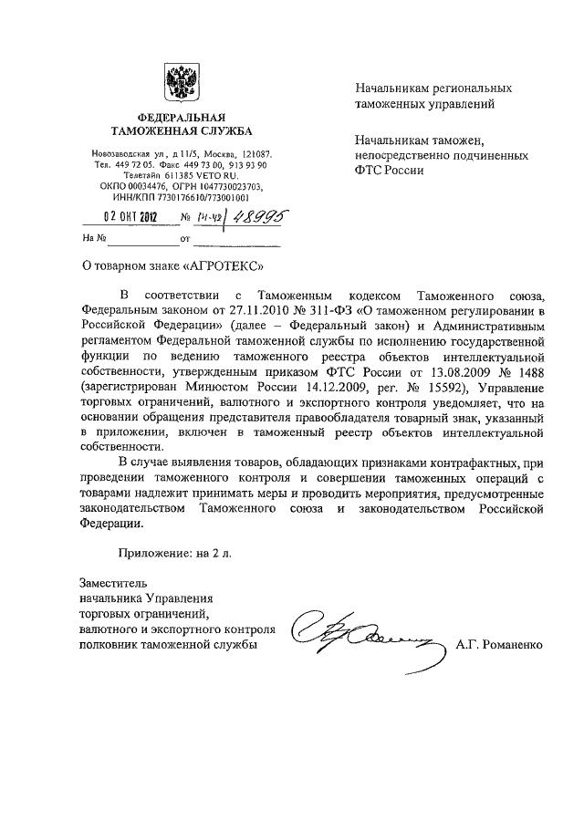 ПИСЬМО ФТС РФ от 02.10.2012 N 14-42/48995