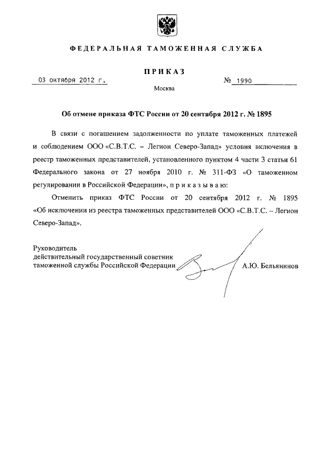 "ОБ ОТМЕНЕ ПРИКАЗА ФТС РОССИИ ОТ 20 СЕНТЯБРЯ 2012 Г. N 1895"