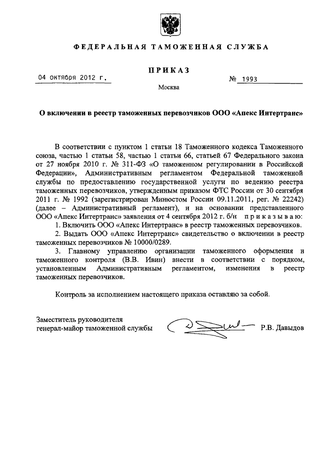 "О ВКЛЮЧЕНИИ В РЕЕСТР ТАМОЖЕННЫХ ПЕРЕВОЗЧИКОВ ООО "АПЕКС ИНТЕРТРАНС"