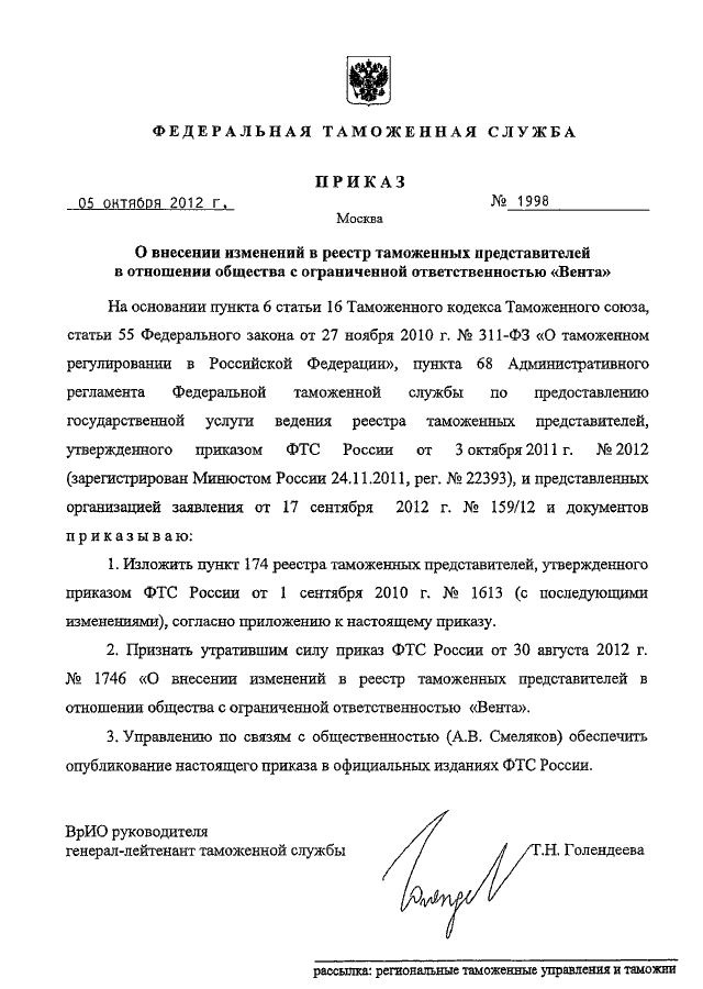 ПРИКАЗ ФТС РФ от 05.10.2012 N 1998