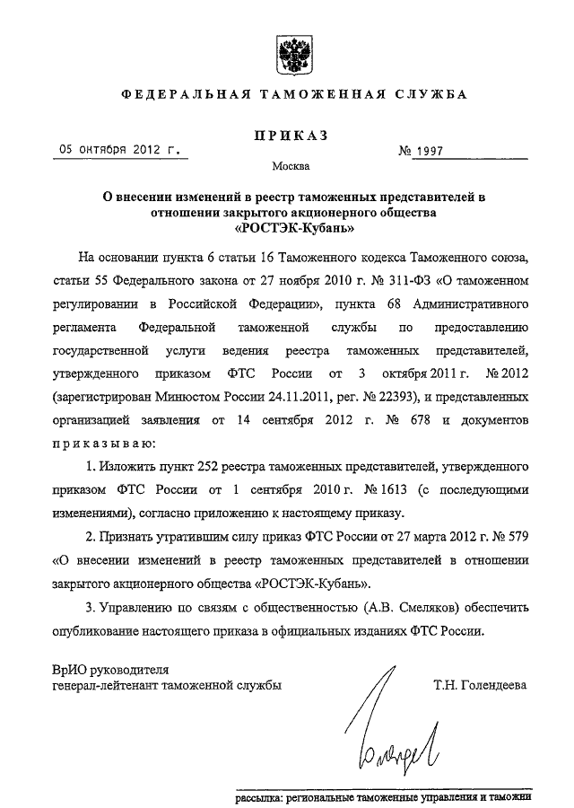 ПРИКАЗ ФТС РФ от 05.10.2012 N 1997