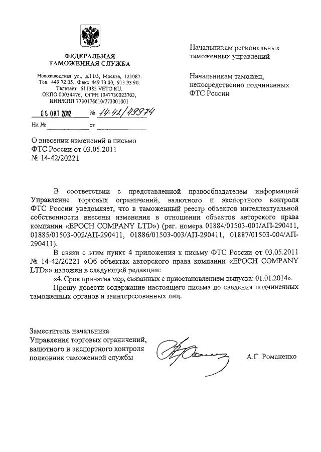 ПИСЬМО ФТС РФ от 08.10.2012 N 14-42/49974