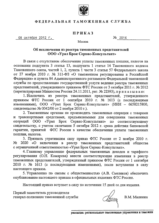 "ОБ ИСКЛЮЧЕНИИ ИЗ РЕЕСТРА ТАМОЖЕННЫХ ПРЕДСТАВИТЕЛЕЙ ООО "УРАЛ БРОК СЕРВИС - КОНСУЛЬТАНТ"