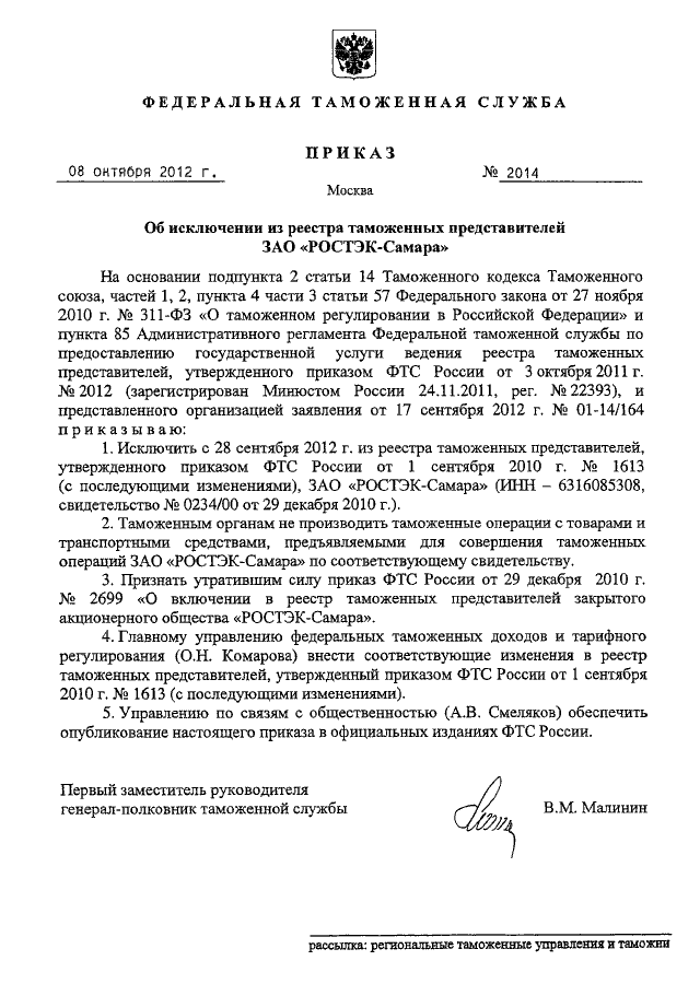 ПРИКАЗ ФТС РФ от 08.10.2012 N 2014