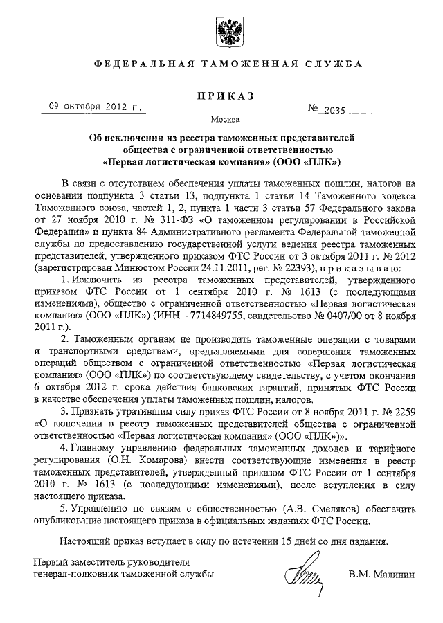 "ОБ ИСКЛЮЧЕНИИ ИЗ РЕЕСТРА ТАМОЖЕННЫХ ПРЕДСТАВИТЕЛЕЙ ОБЩЕСТВА С ОГРАНИЧЕННОЙ ОТВЕТСТВЕННОСТЬЮ "ПЕРВАЯ ЛОГИСТИЧЕСКАЯ КОМПАНИЯ" (ООО "ПЛК")"