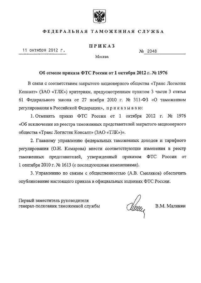 ПРИКАЗ ФТС РФ от 11.10.2012 N 2048