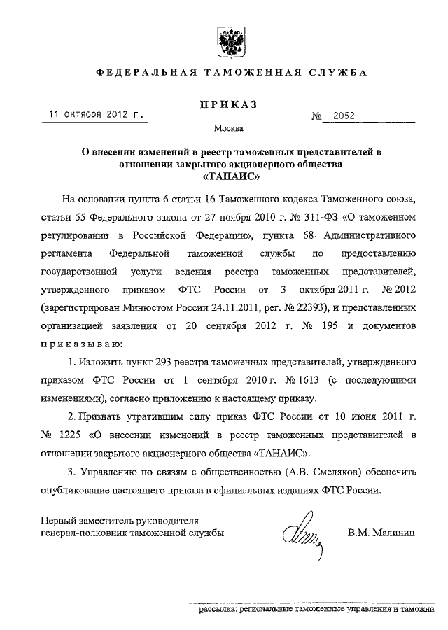 ПРИКАЗ ФТС РФ от 11.10.2012 N 2052
