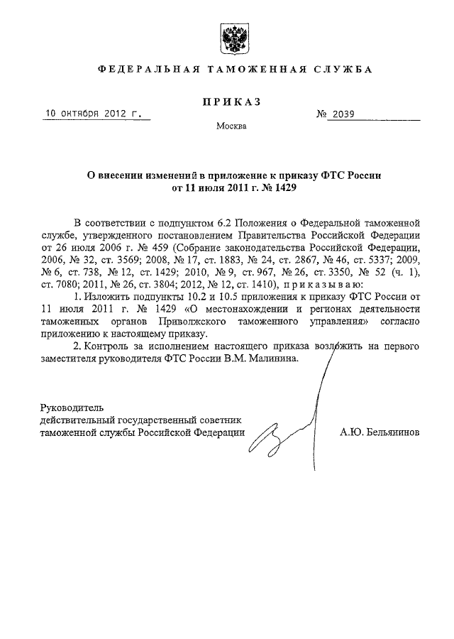 ПРИКАЗ ФТС РФ от 10.10.2012 N 2039
