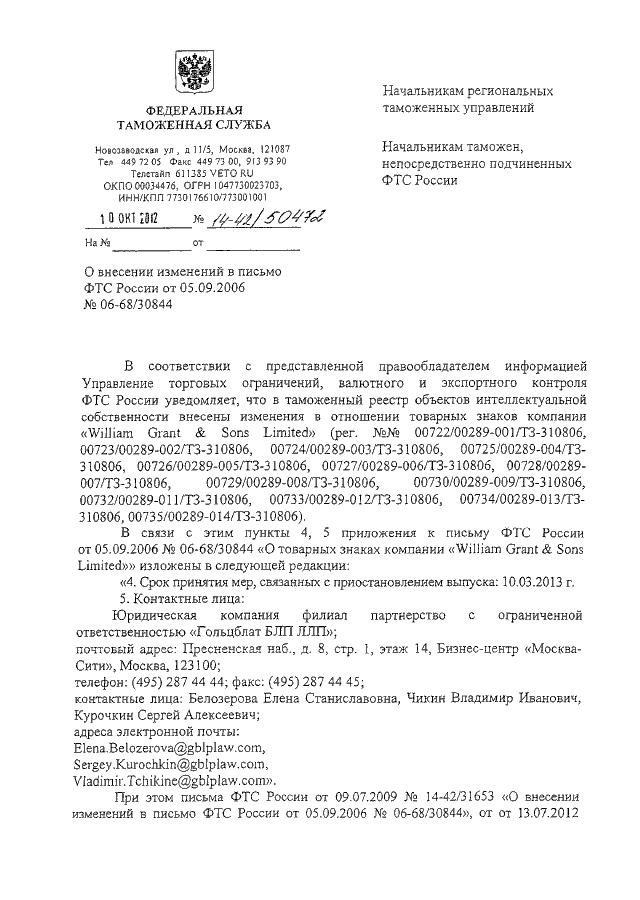 ПИСЬМО ФТС РФ от 10.10.2012 N 14-42/50472