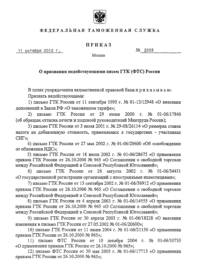 ПРИКАЗ ФТС РФ от 11.10.2012 N 2058