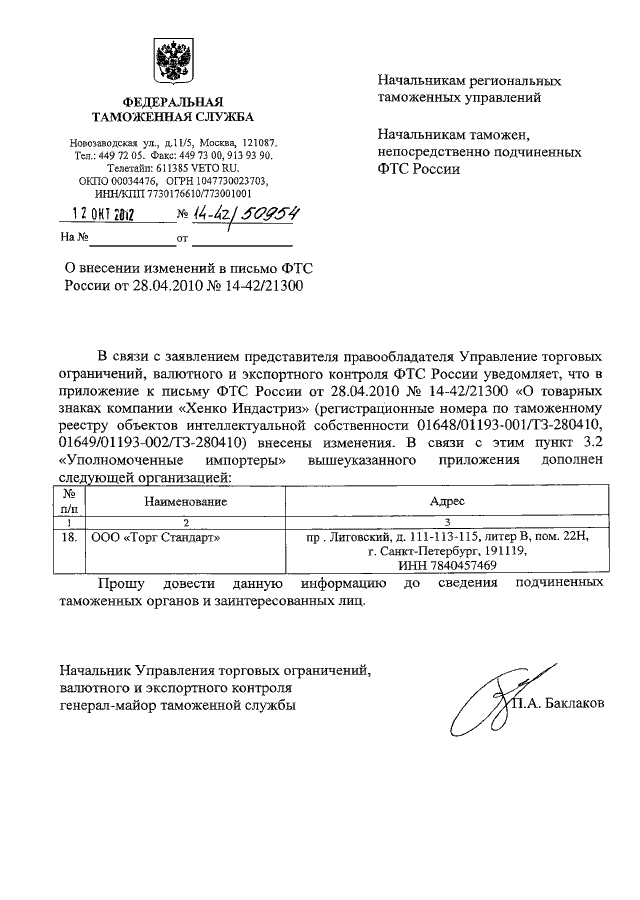 ПИСЬМО ФТС РФ от 12.10.2012 N 14-42/50954
