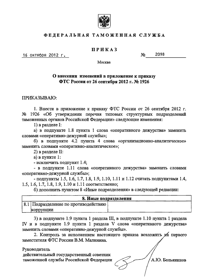 ПРИКАЗ ФТС РФ от 16.10.2012 N 2098