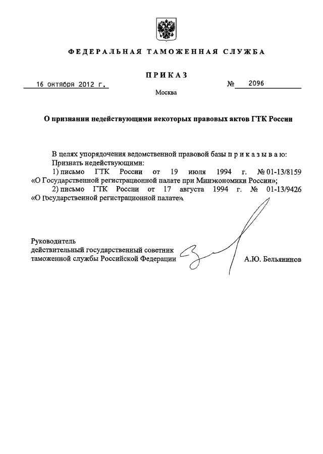 ПРИКАЗ ФТС РФ от 16.10.2012 N 2096