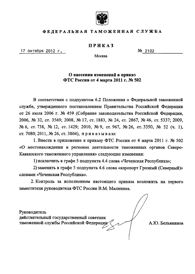 ПРИКАЗ ФТС РФ от 17.10.2012 N 2102