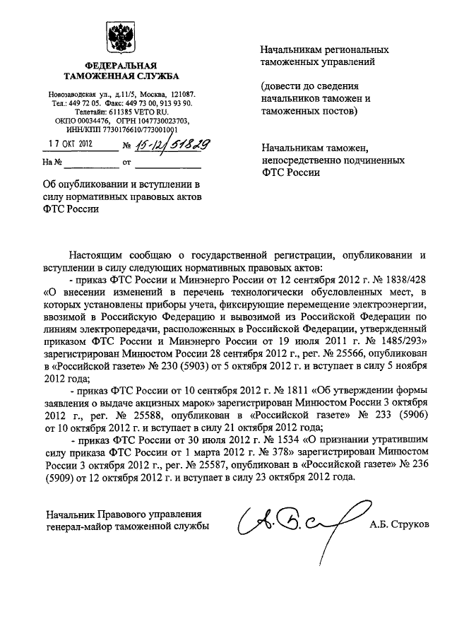 "ОБ ОПУБЛИКОВАНИИ И ВСТУПЛЕНИИ В СИЛУ НОРМАТИВНЫХ ПРАВОВЫХ АКТОВ ФТС РОССИИ"