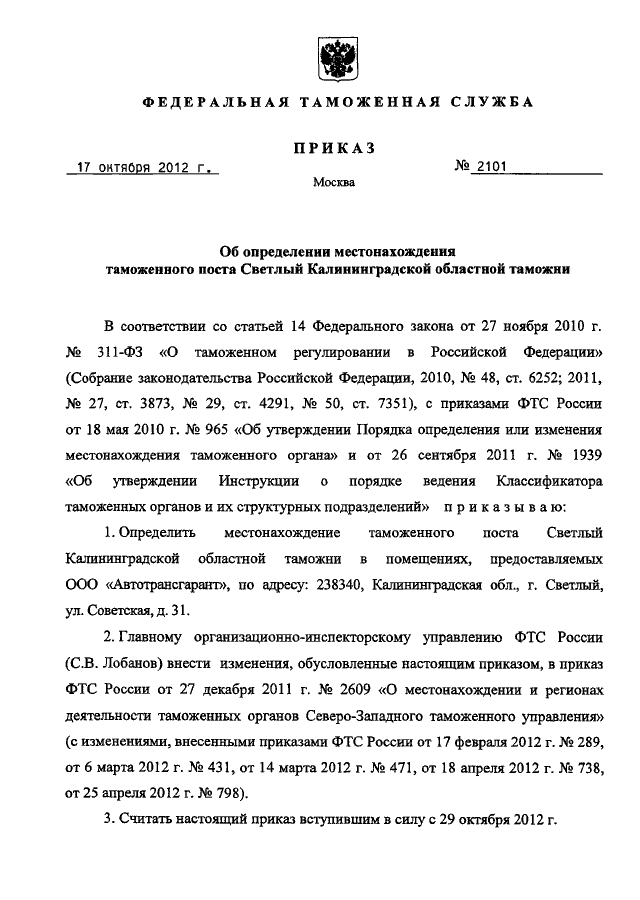 "ОБ ОПРЕДЕЛЕНИИ МЕСТОНАХОЖДЕНИЯ ТАМОЖЕННОГО ПОСТА СВЕТЛЫЙ КАЛИНИНГРАДСКОЙ ОБЛАСТНОЙ ТАМОЖНИ"