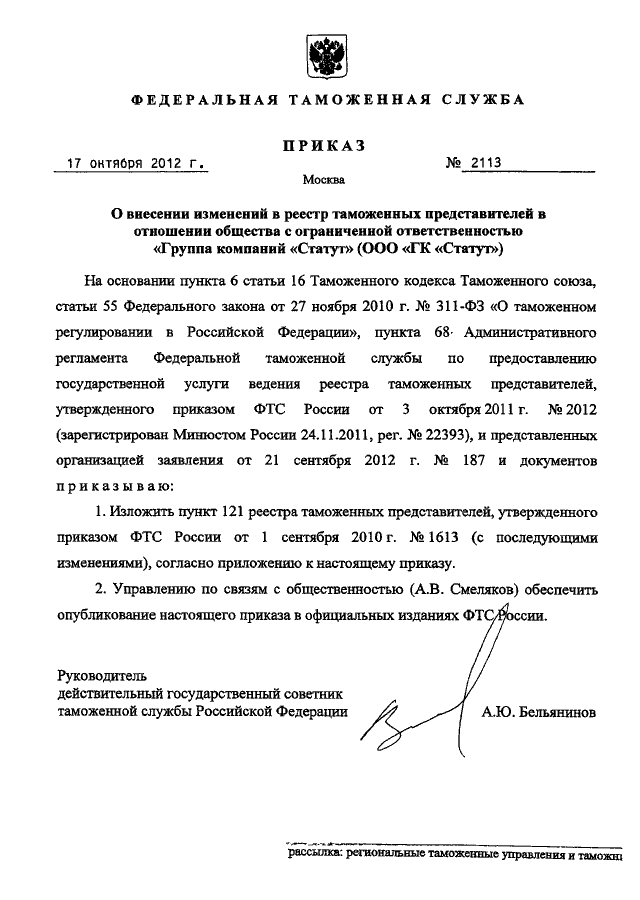 ПРИКАЗ ФТС РФ от 17.10.2012 N 2113