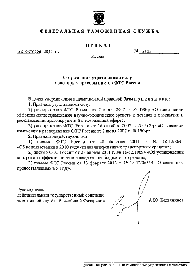 ПРИКАЗ ФТС РФ от 22.10.2012 N 2123