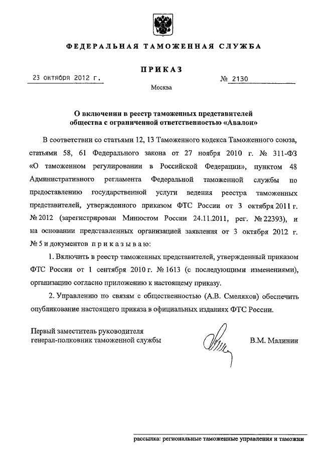 ПРИКАЗ ФТС РФ от 23.10.2012 N 2130