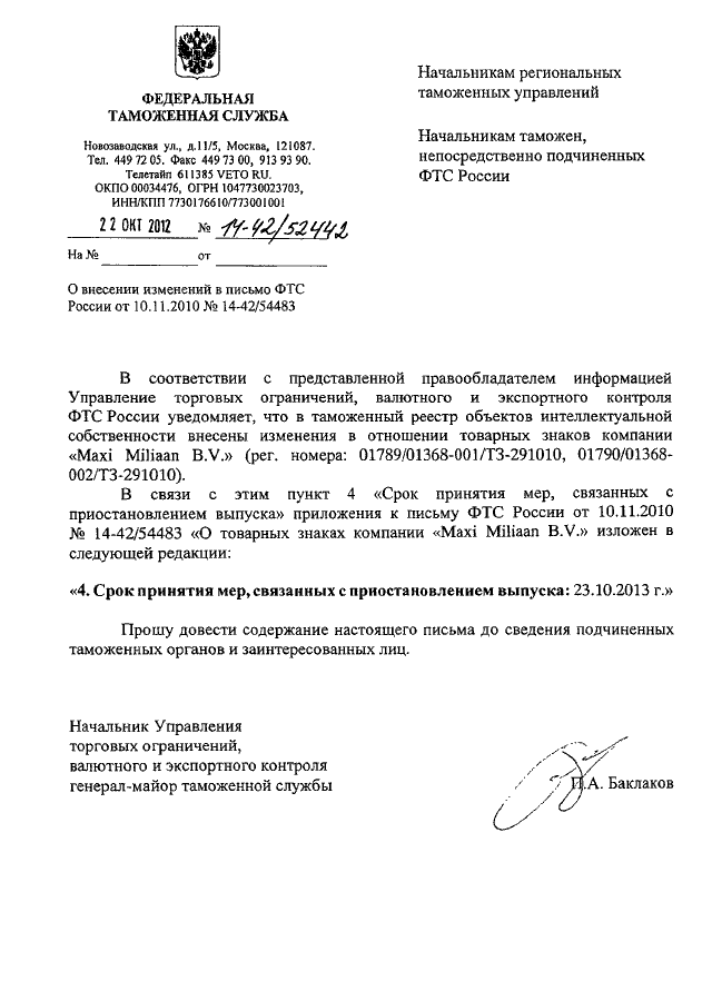 ПИСЬМО ФТС РФ от 22.10.2012 N 14-42/52442