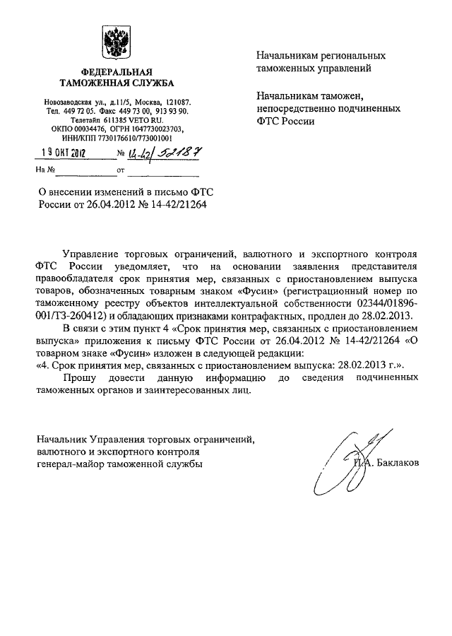 "О ВНЕСЕНИИ ИЗМЕНЕНИЙ В ПИСЬМО ФТС РОССИИ ОТ 26.04.2012 N 14-42/21264"