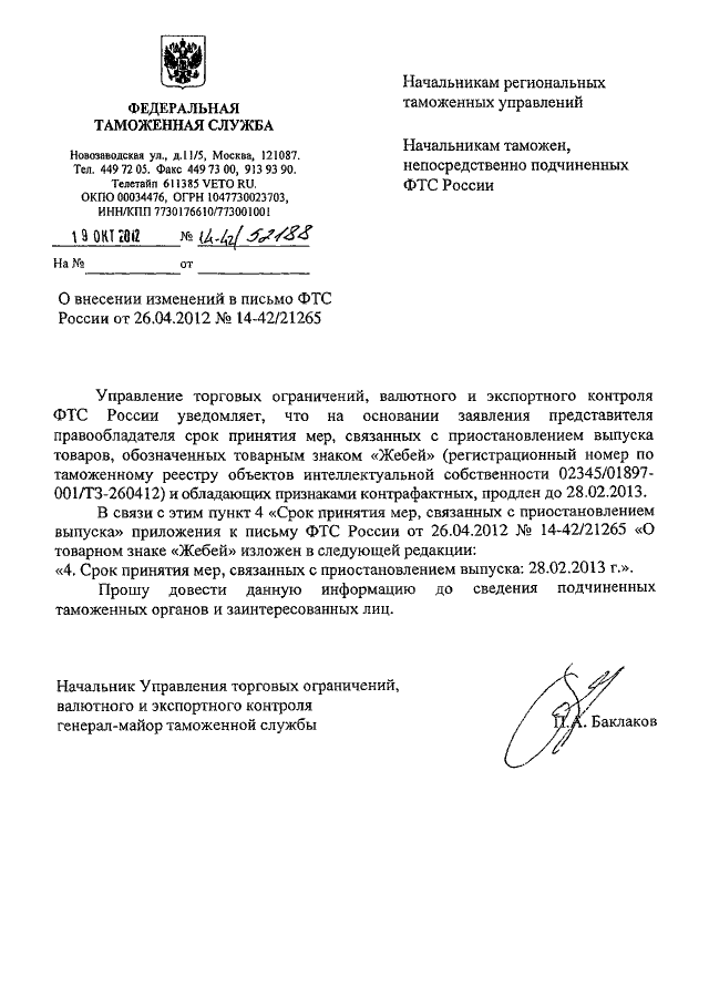 "О ВНЕСЕНИИ ИЗМЕНЕНИЙ В ПИСЬМО ФТС РОССИИ ОТ 26.04.2012 N 14-42/21265"
