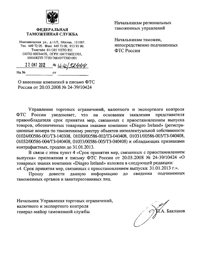 "О ВНЕСЕНИИ ИЗМЕНЕНИЙ В ПИСЬМО ФТС РОССИИ ОТ 20.03.2008 N 24-39/10424"