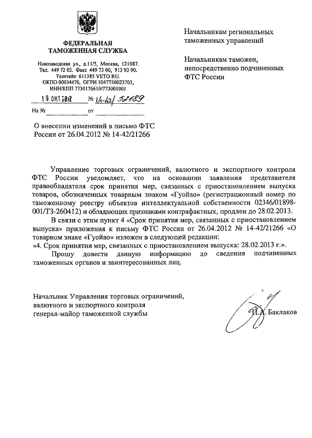 "О ВНЕСЕНИИ ИЗМЕНЕНИЙ В ПИСЬМО ФТС РОССИИ ОТ 26.04.2012 N 14-42/21266"