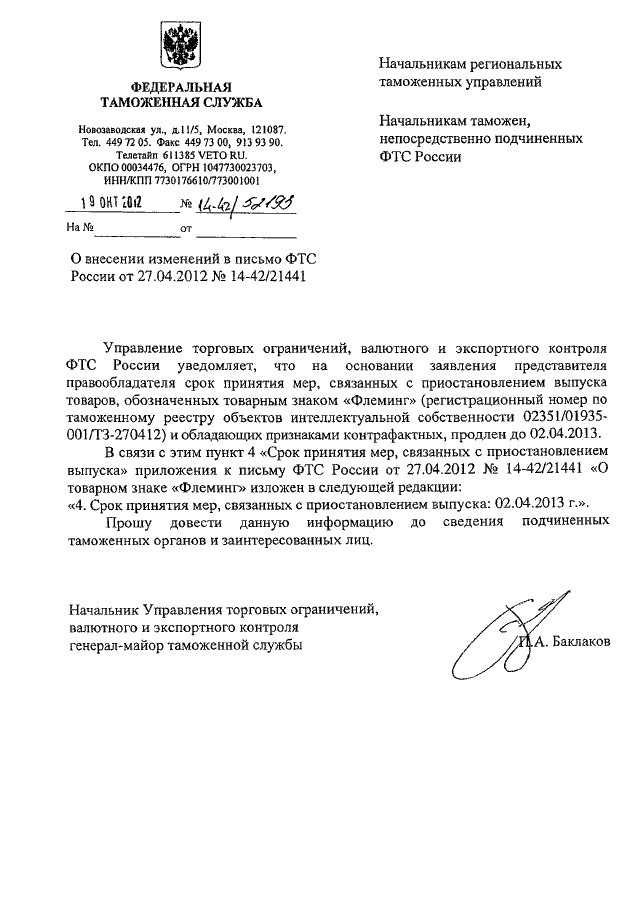"О ВНЕСЕНИИ ИЗМЕНЕНИЙ В ПИСЬМО ФТС РОССИИ ОТ 27.04.2012 N 14-42/21441"