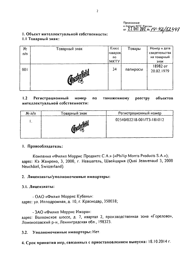"О ТОВАРНОМ ЗНАКЕ "CHESTERFIELD"