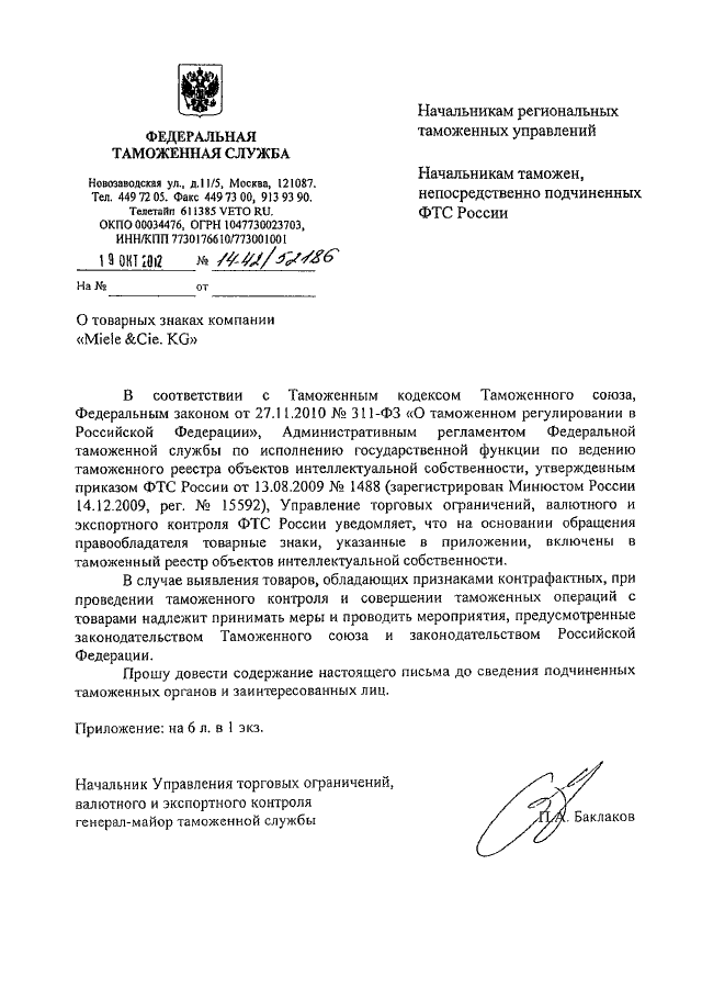 ПИСЬМО ФТС РФ от 19.10.2012 N 14-42/52186