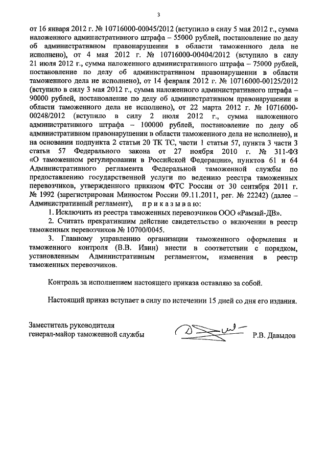 "ОБ ИСКЛЮЧЕНИИ ИЗ РЕЕСТРА ТАМОЖЕННЫХ ПЕРЕВОЗЧИКОВ ООО "РАМЗАЙ-ДВ"