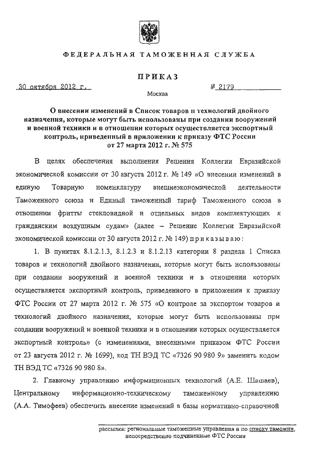 ПРИКАЗ ФТС РФ от 30.10.2012 N 2179 "О ВНЕСЕНИИ ИЗМЕНЕНИЙ В СПИСОК ТОВАРОВ И ТЕХНОЛОГИЙ ДВОЙНОГО