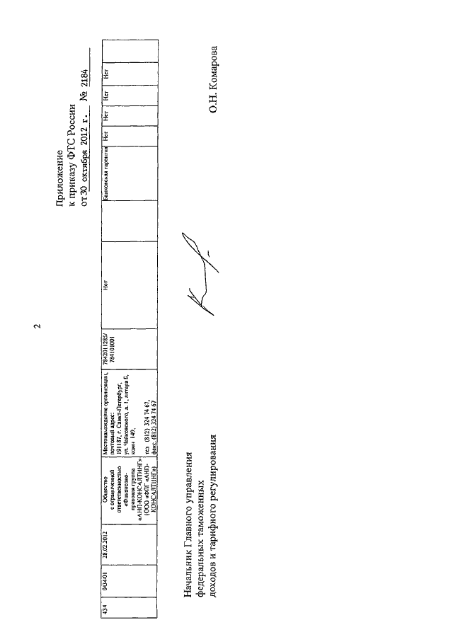 ПРИКАЗ ФТС РФ от 30.10.2012 N 2184