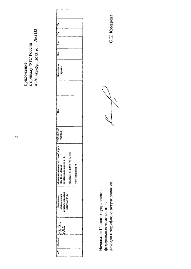 ПРИКАЗ ФТС РФ от 30.10.2012 N 2182