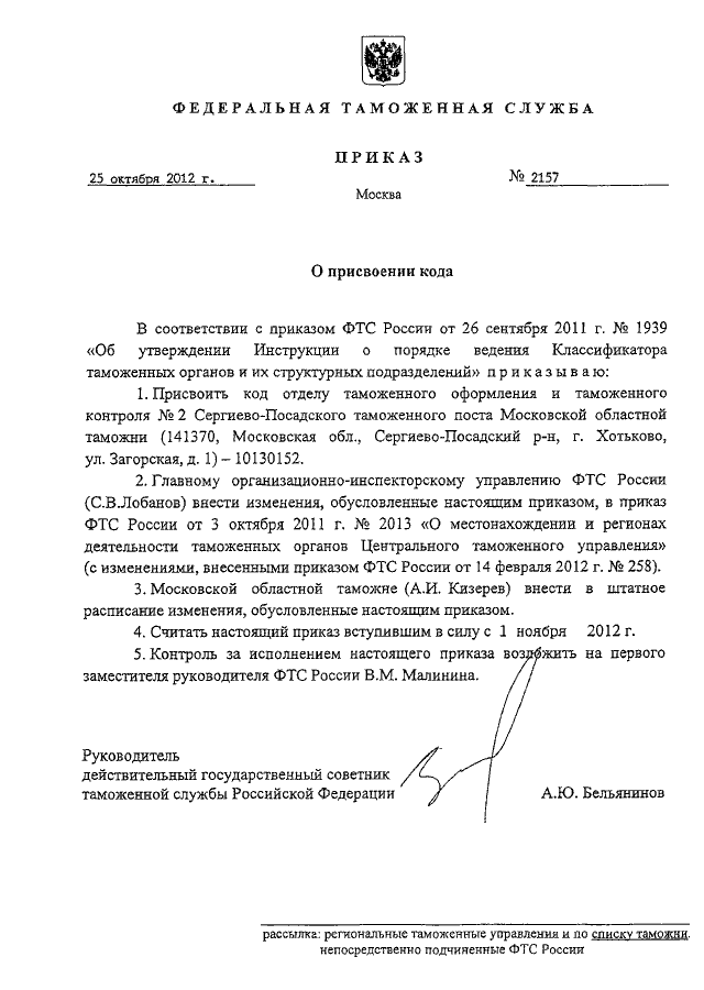 ПРИКАЗ ФТС РФ от 25.10.2012 N 2157