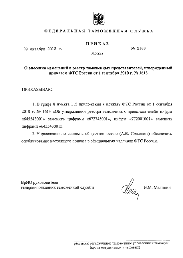 ПРИКАЗ ФТС РФ от 29.10.2012 N 2166